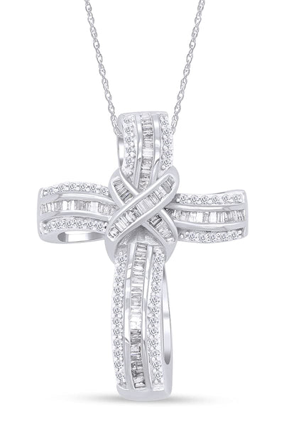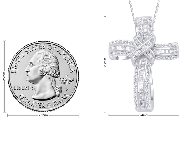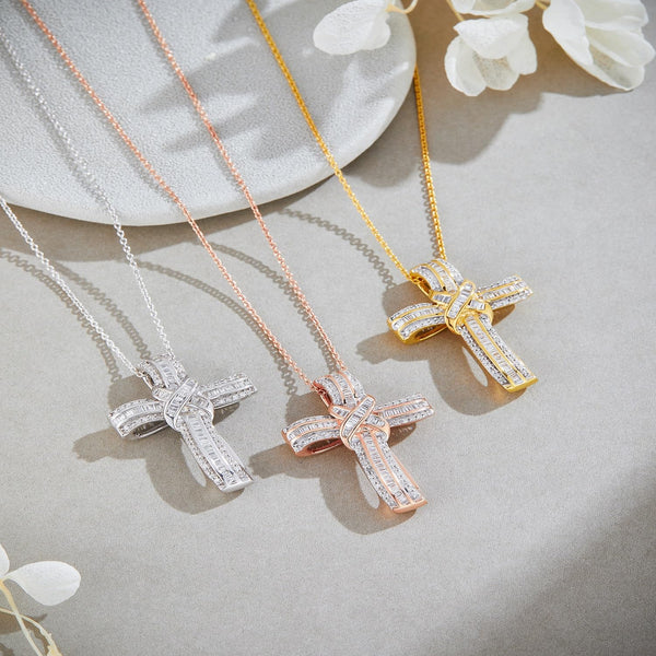- Crafted in precious 14k Gold Over Sterling Silver, this shimmering design features round and baguette-cut diamonds that loop into the inspirational style. Radiant with 1.00 ct. t.w. of diamonds and a brilliant buffed luster, this pendant suspends along an 18.0-inch rope chain that secures with a spring-ring clasp. The design of cross necklace and diamond inset,make it look noble and fashionable Wearing. Crafted In 14k Yellow Gold Over Sterling Silver.