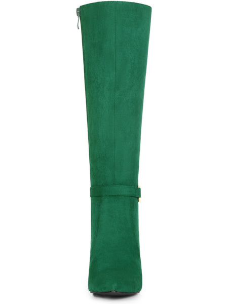 - Knee High Boots, Pointy Toe, Zipper Closure, Stiletto Heel, Buckle Decor