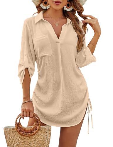 - Women's swimwear cover ups: Shirt collar, half sleeve with button cuffs, easily dress down and up. Interesting side drawstring design, can be adjusted at will, perfect to show your sexy curves