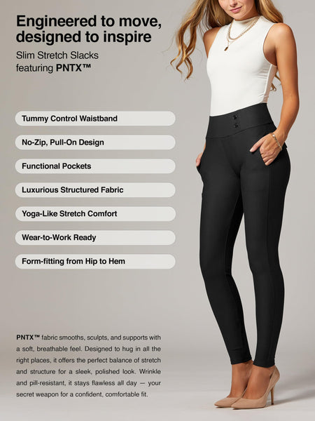 Discover your perfect fit with our high-rise knit dress pants, available in both slim and flared silhouettes. Whether you prefer a sleek, form-fitting look or a polished flare from knee to hem, these pants are designed to sculpt, smooth, and flatter. Made from dense, luxurious knit fabric that conceals lines and bumps, they deliver yoga-like comfort with the structure you need for work or after-hours. A tummy-control waistband provides effortless support, while phone-friendly pockets and an easy pull-on design keep things functional. Wrinkle-resistant, anti-chafing, and offered in inclusive sizing and essential shades—this is style and comfort, perfected.