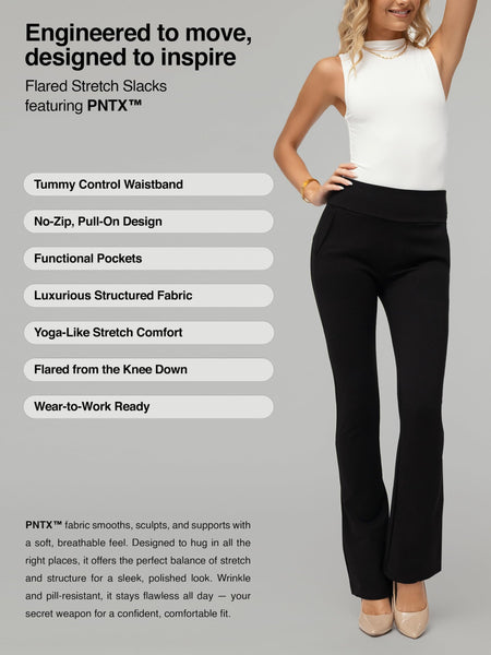Discover your perfect fit with our high-rise knit dress pants, available in both slim and flared silhouettes. Whether you prefer a sleek, form-fitting look or a polished flare from knee to hem, these pants are designed to sculpt, smooth, and flatter. Made from dense, luxurious knit fabric that conceals lines and bumps, they deliver yoga-like comfort with the structure you need for work or after-hours. A tummy-control waistband provides effortless support, while phone-friendly pockets and an easy pull-on design keep things functional. Wrinkle-resistant, anti-chafing, and offered in inclusive sizing and essential shades—this is style and comfort, perfected.