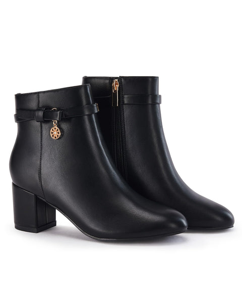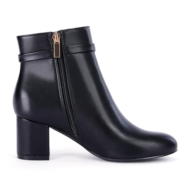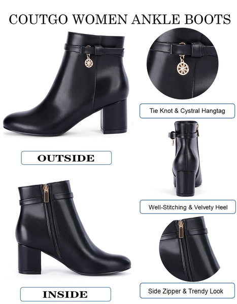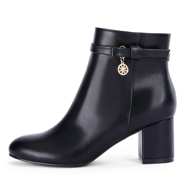 - Features- Our sophisticated ankle-cuff boots feature a sturdy mid-block heel, slip-resistant sole, round toe, solid color, side zippers, finished with an archival strap, and a mini crystal hangtag. It's a timeless classy look.