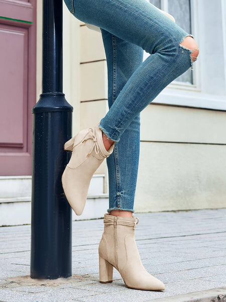 - Features: Pointed toe, chunky block heel, soft faux suede upper, side zip closure, cute bow decor, solid color, anti slip. Fashion ankle boots for women and teen girls.