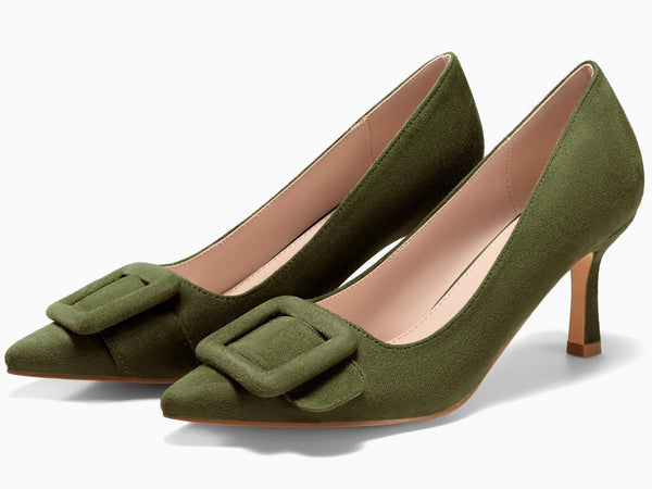 - DESIGN: These 3 inches kitten heel pumps feature a classic pointed toe and square buckle design, make you stand out and feel confident in a crowd