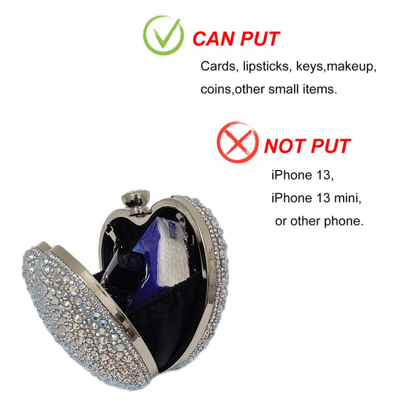 - ♥Size & Capacity.♥ This is a Locking type evening bag. Dimensions: L5.51 x H4.33 x W2.75 inches, about 14 x 11 x 7cm. It has a Small capacity, Can NOT hold Iphone 13 mini, BUT it can hold keys, credit cards, lipsticks or other small things. Charming and dazzling appearance,about 0.66 pounds (0.30 kg), very easy to hold in the hand.