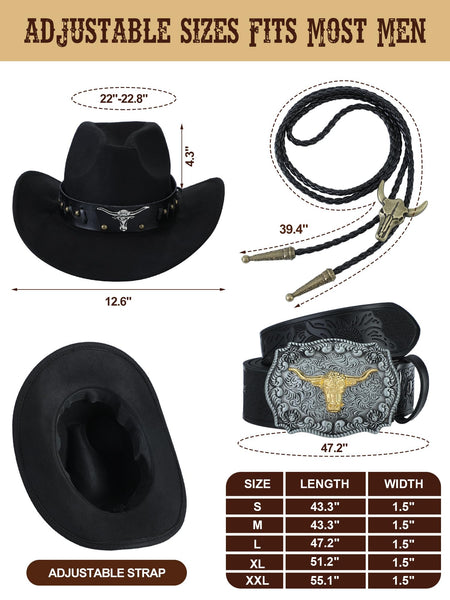 - Suitable for Most Men: the men's western vest is available in sizes S, M, L, XL, XXL, and XXXL to fit most people; The cowboy hat is a one-size-fits-all design, with a head circumference range of approximately 22-22.8 inches (about 56-58 cm). We recommend that you check your head circumference before placing an order to ensure a comfortable fit; The denim buckle belt and bolo tie are designed to accommodate men of all sizes; Note: please carefully review the size chart before ordering