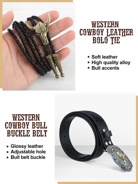 - Complete Cowboy Attire: unleash your inner cowboy with this inclusive set featuring 1 men's cowboy vest, 1 western hat, 1 cowboy buckle belt, 1 western vintage bolo necktie; Create an authentic cowboy look with this meticulously crafted outfit, ideal for cosplay, themed parties, or casual outings