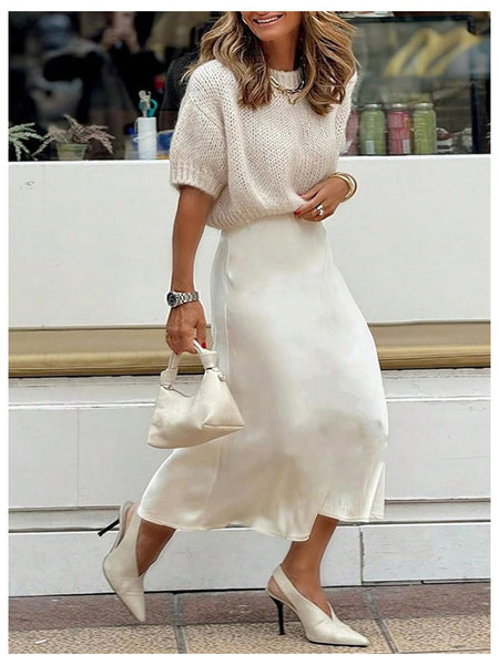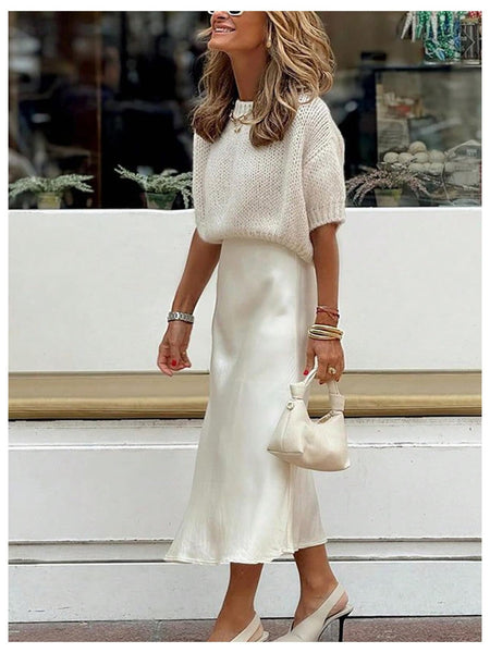 - The pullover sweater features drop shoulder, round neck, short sleeve, knit wear, crop top