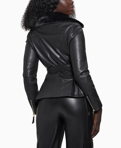 - Faux leather Peplum Jacket with removable belt and faux fur collar