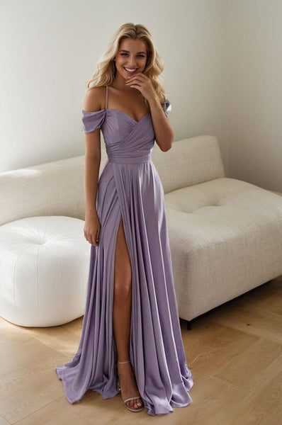 - Style: off shoulder bridesmaid dress with slit spaghetti strap a line formal Wedding dress for wedding guest satin ruched prom dresses for women long sweetheart cold shoulder evening ball gown
