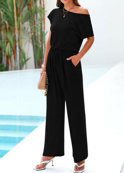 - Women Jumpsuits Dressy Casual: Off The Shoulder Design Adds An Elegant Touch To The Wide Leg Jumpsuit For Women. Fashion One Piece Jumpsuit-Drawstring Elastic Waist Offers An Adjustable Fit That Flatters Your Figure And Ensures Comfort Throughout The Day Without Compromising Style