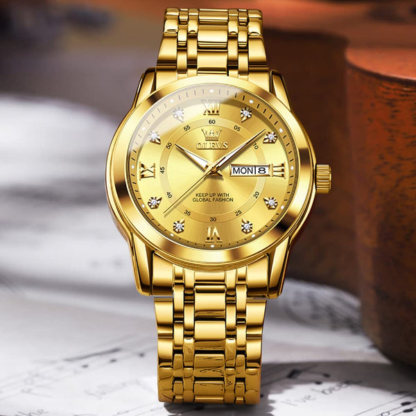 - 【Material 】Gold Stainless Steel Men Watch with high quality quartz movement,scratch-resistant.Gold face men watch thick 11MM(0.43inch),Diameter 40MM(1.57inches) ,Steel band Width 21mm(0.82), Length 21cm(0.82).Dress Men's Watch Weight 85G(2.998 ounces) 💗Classic Mens Watch Keep Time Accurate