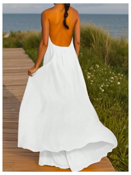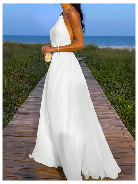 - Features: Elegant long dress for women features a halter neck design with golden chain, a fitted bodice, and a flowing floor-length skirt that adds a dramatic flair