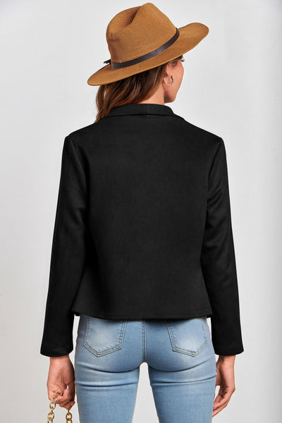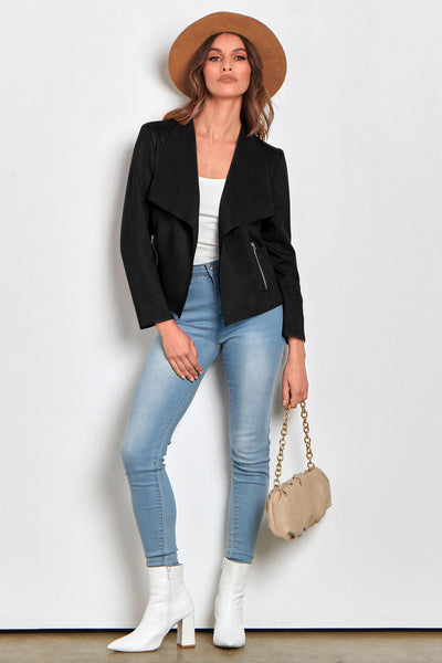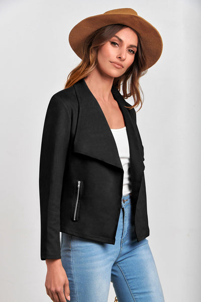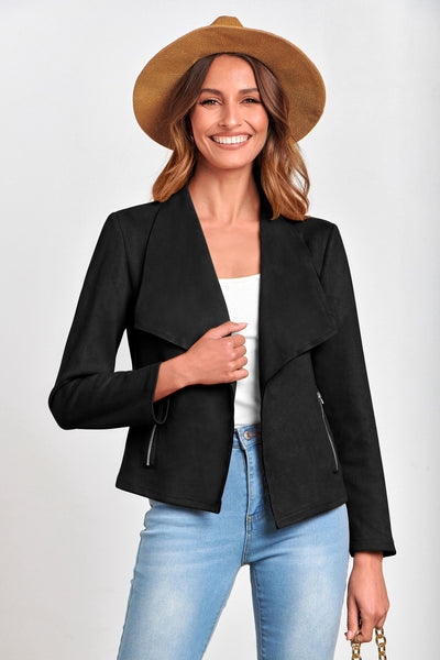 - TRENDY FEATURES: Women Cropped Jackets Stands Out With Its Waterfall Collar And Open Front Design, Giving It A Fashionable Look. Ladies Faux Suede Jackets Has Two Side Pockets Which Can Be Opened With Zippers, Adding A Stylish Detail To The Overall Design. The Casual Coat Outwear Offers A Comfortable Fit That Complements Your Figure. The Faux Suede Material Adds A Touch Of Sophistication To Any Outfit, Making It Perfect For Casual Or Dressed-Up Occasions.