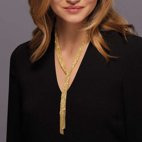 - ITALIAN 18KT GOLD OVER STERLING — Italian 18kt yellow gold over sterling silver mesh tie necklace. Wear it tied as a necklace or wrapped into a bracelet. Polished finish. 32 in. long (including fringe trim) by 1/2 in. wide. Clasp-free design.