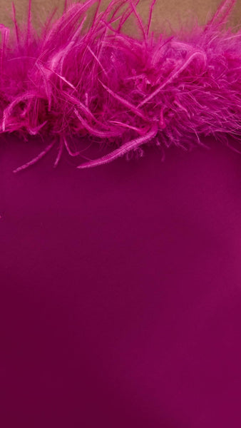 - Faux ostrich feathers at neckline