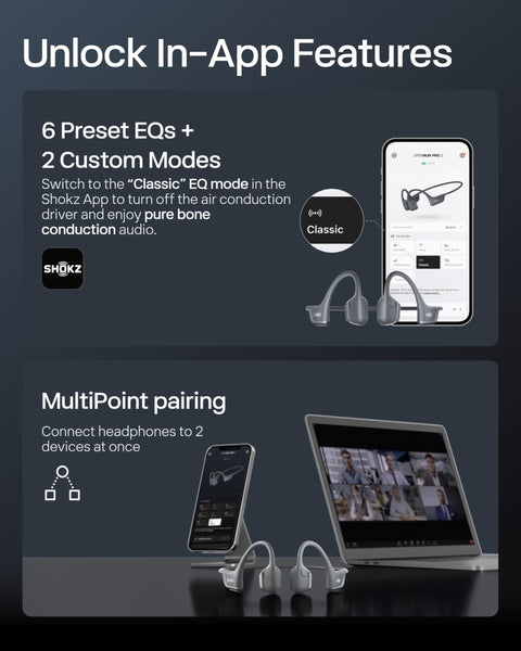 - Dedicated EQ Modes - Customize your audio experience with our dedicated EQ modes on the Shokz App. Enjoy pure bone conduction sound with the newly launched Classic Mode, or boost your audio in noisy environments with Volume Boost Mode.