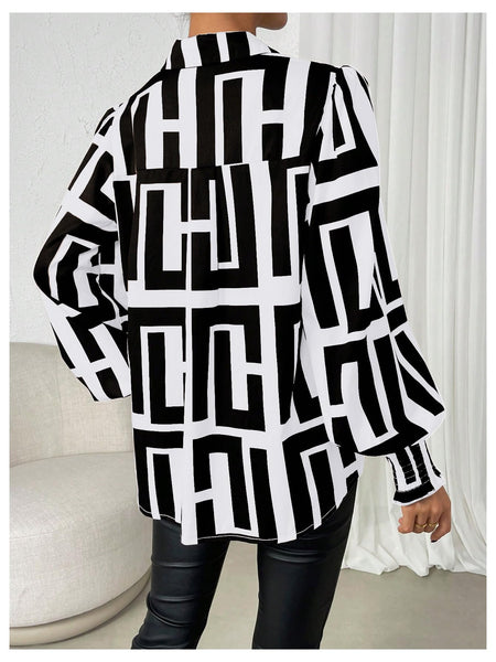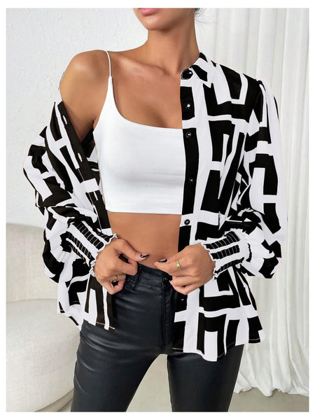 - Feature: Graphic print, collar neck, long sleeve, regular fitted, smooth to skin, button front, fashionable