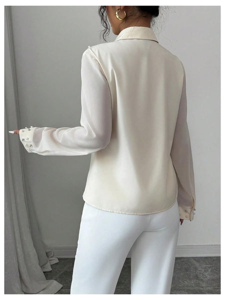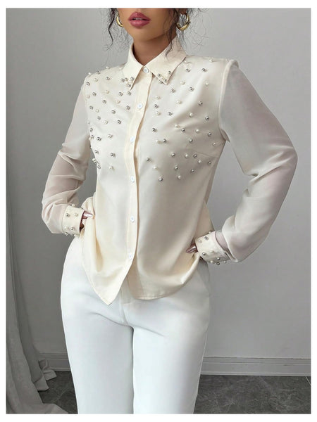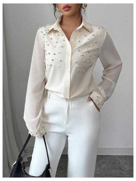 - Features: Pearl beaded, shirt collar, long sleeve, button down work shirt
