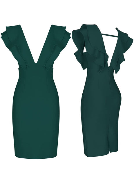 - Feature:This sexy bandage dress features flattering ruffle sleeve,back spilt,knee length cutout,tight fit,plunge v on front and back,highlight your sexy chestline
