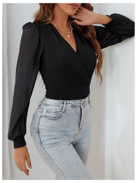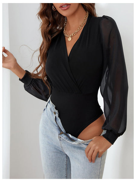 - Features: Bodysuit for women, sheer mesh, v neck, wrap front, long sleeve, bishop sleeve, business casual outfit